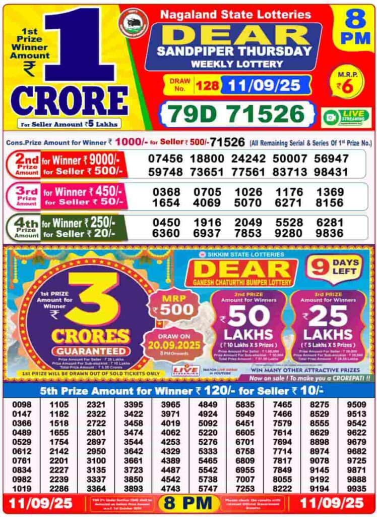 Nagaland Dear Sandpiper Thursday Lottery Result – 11 September 2025 (8 PM)