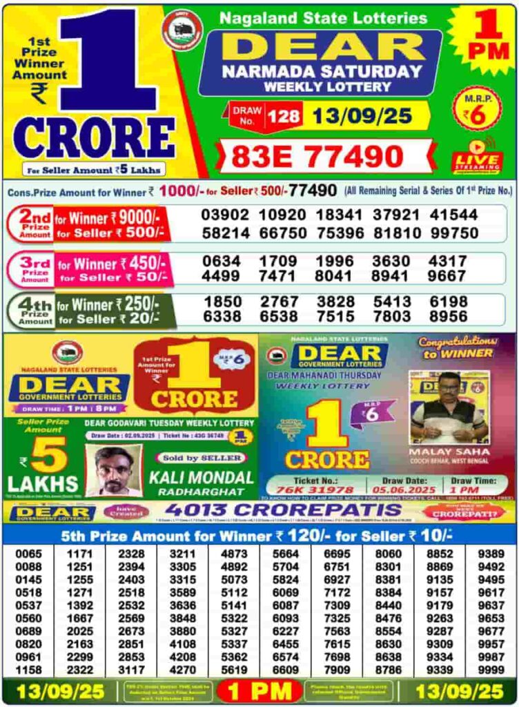 Nagaland State Lottery Result – Dear Narmada Saturday Weekly (13/09/2025 – 1 PM)