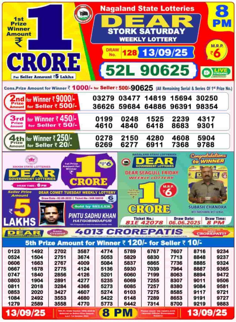 Nagaland State Lottery Dear Stork Saturday Result – 13 September 2025 (8 PM)